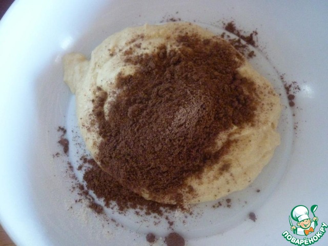 Divide the dough into 2 parts. One of them is to add bird-cherry flour and cream.