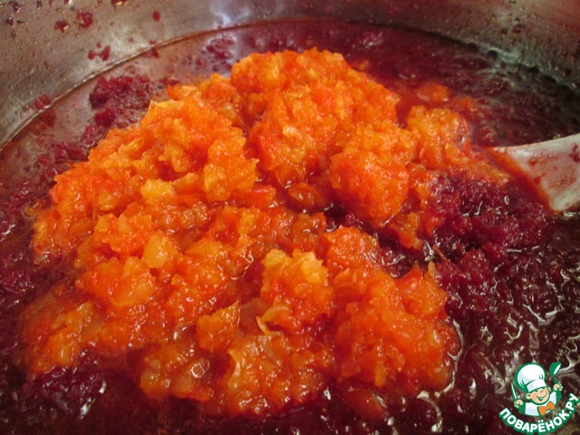 Тщательно перемешиваем и ставим на плиту. Сначала даём сильный огонь. В это время от свеклы не отходим, постоянно помешиваем и доводим до кипения. Затем убавляем огонь на медленный, и варим, периодически помешивая, 30 минут.