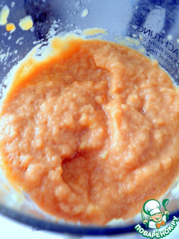 Загружаем полученное пюре (у меня получилось примерно 700 мл, если верить делениям на чаше блендера) в хлебопечку. Главное не забудьте вставить лопатку для перемешивания, хотя на первом этапе она нам не нужна, но потом вставить ее будет уже проблематично. Выбираем режим "выпечка", он у меня по программе длится ровно час. Хотя по прочитанным мною сведениям перемешивать на этом этапе не нужно, но я для перестраховки пару раз вручную перемешивала - ничего не пригорело.