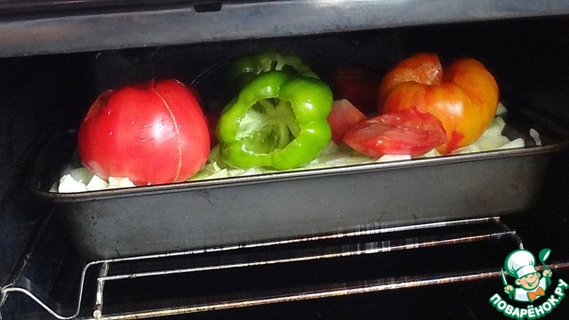Достать противень с овощами из духовки. Снять с помидор и сладкого перца шкурки.