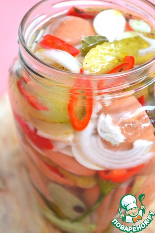 Аккуратно выкладываем все в баночку с широким горлом. Кольца лука, шпикачки, оставшиеся огурчики, перчик, чеснок, не забываем про лавровый лист и перец горошком. Теперь подогреваем маринад до очень теплого состояния, заливаем в банку и даем остыть. Закрываем крышкой, забываем о ней на недельку-другую. Чем дольше будут мариноваться шпикачки, тем вкуснее и интереснее будет вкус. Ставим мариноваться в прохладное место, у меня они стояли на нижней полке в холодильнике. Это большой плюс - посмотрите какая красивая выходит баночка, она украсит ваш стол! А готовить ничего не придется второпях, просто достанете ее и угостите гостей необычной закуской!