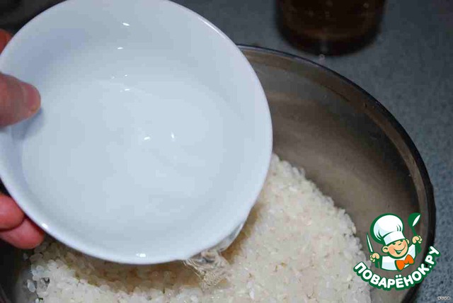 В кастрюльку, желательно с толстым дном, насыпаем рис (у меня расчет на японский манер - чашки типа пиалы), заливаем водой, нежно перемешиваем (лучше рукой) и воду сливаем. Так 2 раза. На третий раз заливаем 5 чашек воды. Ставим на большой огонь. Крышкой не накрываем. Когда рис закипит, уменьшаем огонь до минимума, рис закрываем плотно крышкой и варим ровно 20 минут. По истечении времени огонь выключаем, а крышку еще не поднимаем 10 минут.