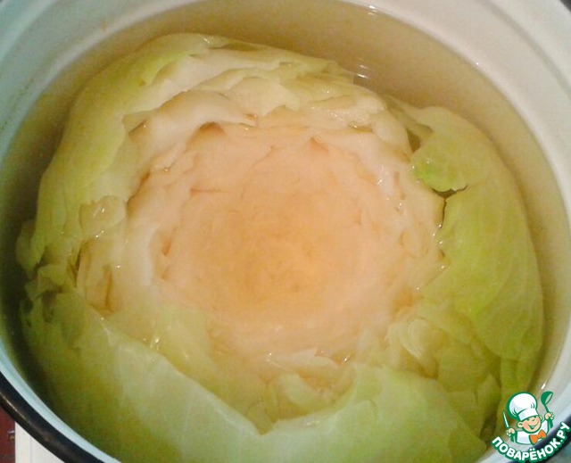 Кипяток сливаем и капусту вынимаем. Середину с неотделенными листьями снова провариваем, т. е. заливаем водой, доводим до кипения, варим 2-3 секунды и выключаем. Ждем, когда листья начнут отделяться. Если у вас очень тугой вилок, то листьям можно помочь при помощи вилок, китайских палочек и т. д. Делаем это осторожно, чтобы не сделать в капусте дырки.