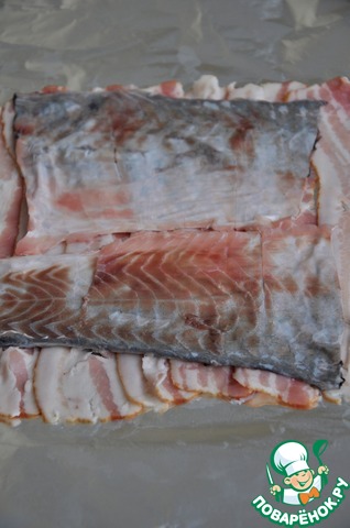 Рыбью кожу разрезать на две части, выстелить ее на бекон.