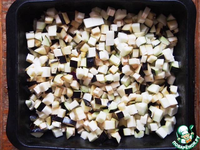 Нарезать кубиками. Затем поместить их в холодную, подсоленную воду на 20 минут, чтобы ушла лишняя горечь.