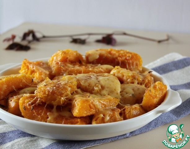 Обжаренную тыкву выложите в форму, посыпьте сыром