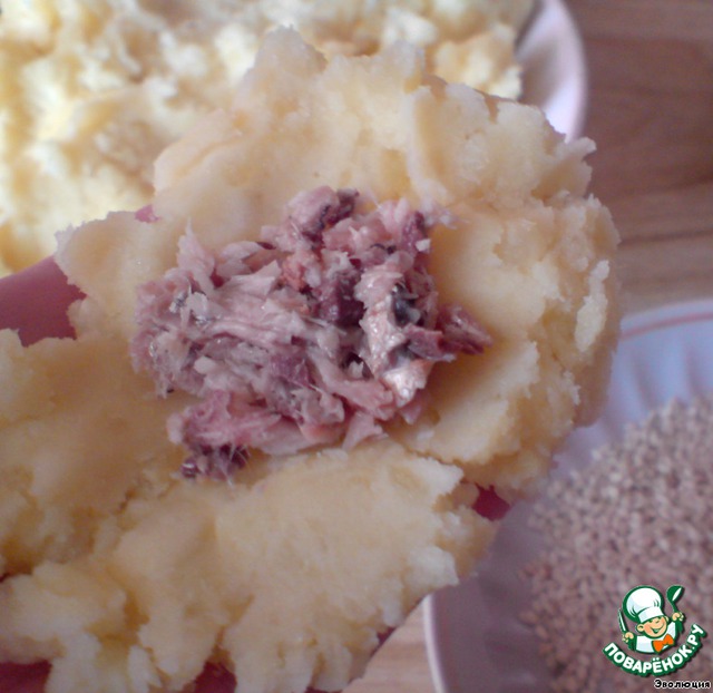 Из картофельного пюре делаем лепешечку на ладони. Кладем размятую рыбку. Замуровываем ее картофельным пюре, катаем шарик.