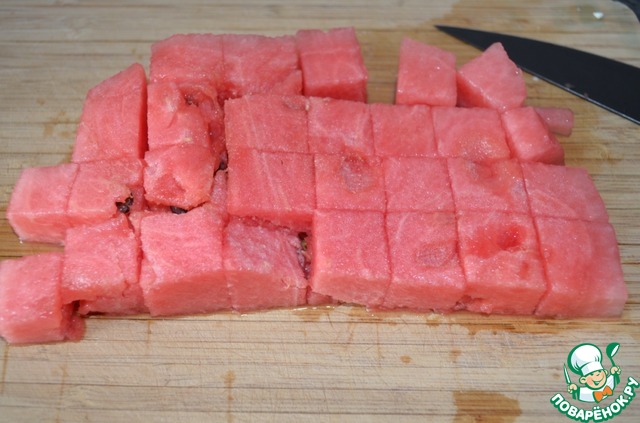 С арбуза срезать корку, удалить все семечки. Арбузную мякоть нарезать небольшими кубиками.