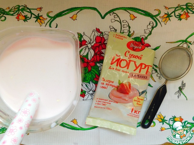 Стакан для приготовления йогурта рассчитан на 1 литр. Для приготовления йогурта смешиваем 850 мл воды и сухую смесь для приготовления йогурта. Мне показалось, что в стакане проблематичным смешать и хорошенько растворить сухую смесь в воде. Поэтому я взяла более просторную ёмкость, венчиком смешала воду и сухую смесь. И на всякий случай процедила получившийся раствор непосредственно в стакан для приготовления йогурта.