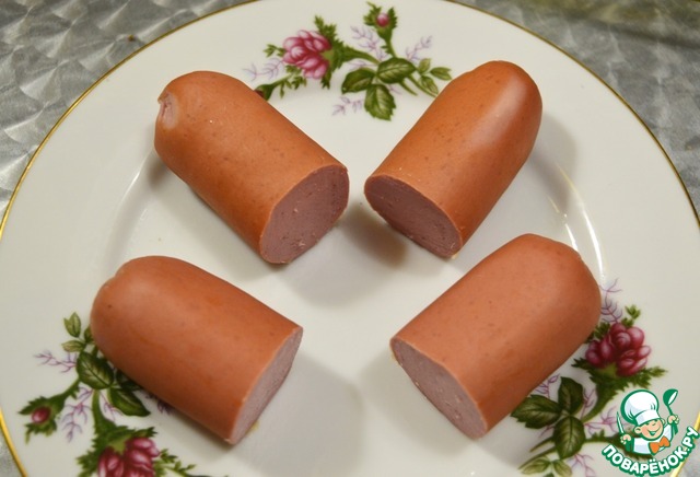 Начнём с того, что поставим разогреваться духовку на 180 градусов. Затем сардельки разрезаем пополам.