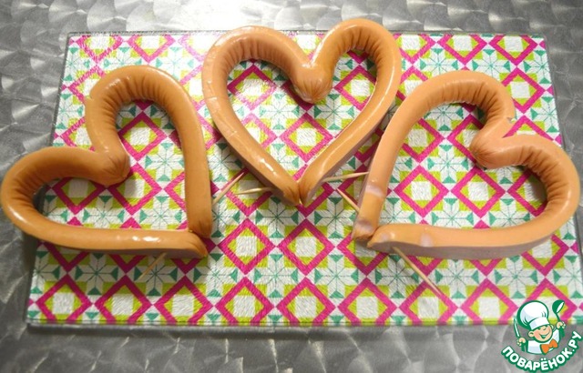 Из сосисок сделать сердечки. Это проще простого! Нужны только зубочистки или шпажки. На фото всё понятно.