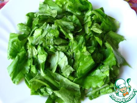Салат вымыть, обсушить, порвать и выложить на блюдо.