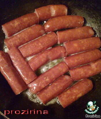 Охотничьи колбаски разрезать пополам и обжарить со всех сторон до золотистой корочки на сливочном масле.