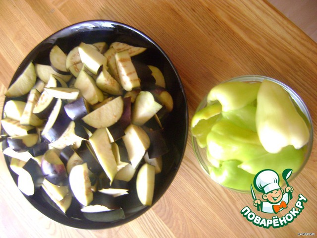 Баклажаны нарезать дольками ( по желанию можно очисть от кожуры) и бланшировать в кипящей воде 15 минут. Если баклажаны не очищены, то в воду добавить 2 ст. л. соли.