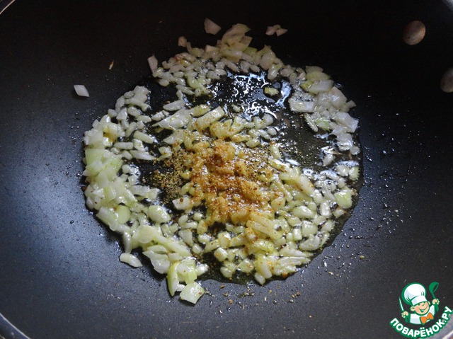 Когда лук станет прозрачным, добавляем часть карри. Перемешиваем.