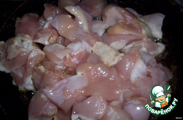 - влить в куриные кусочки сироп из ананасов (весь)+перец+соль, "выжарить "сироп, постоянно перемешивая кусочки курицы (около 15 минут)