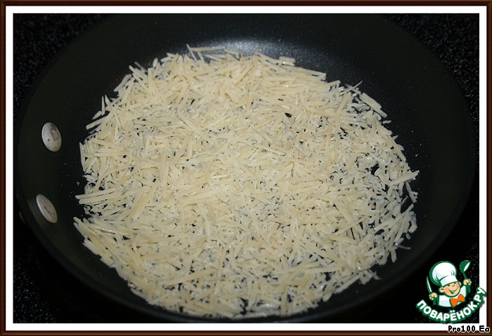 1.Нагреть сухую сковороду и насыпать тёртый на мелкой тёрке Пармезан или любой твёрдый сыр.